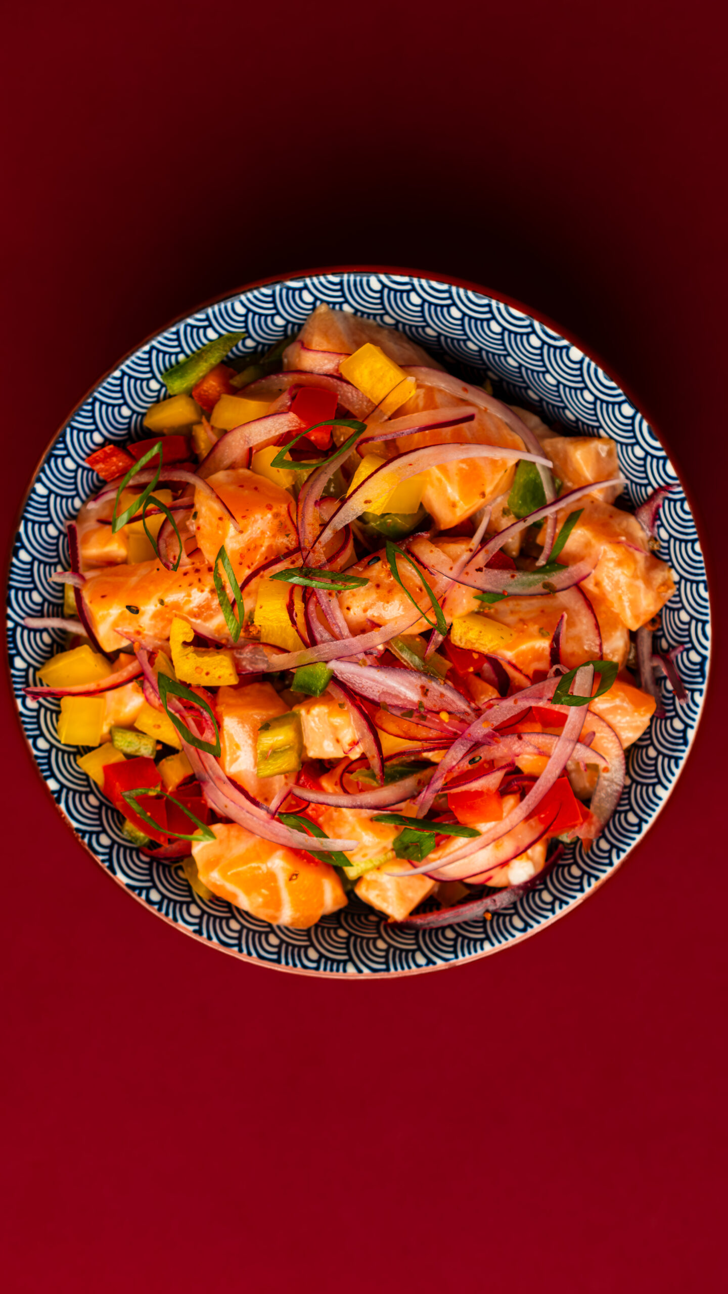 Salmón, locote verde, locote amarillo, locote rojo, cebolla morada, limón, verdeo, Togarashi, sal y pimienta
