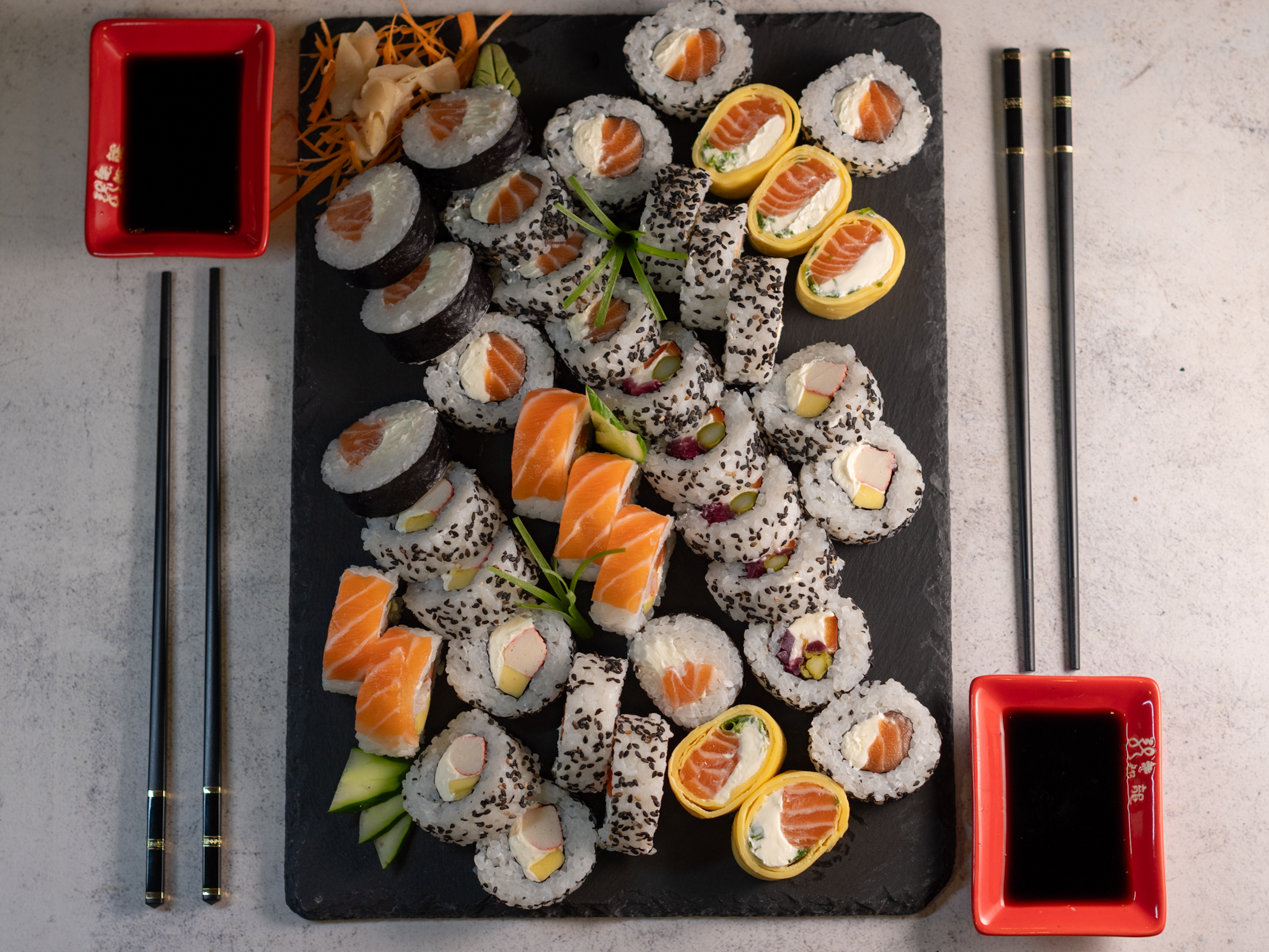 Roll Philadelphia x 10, Roll California roll x 10, Roll Tamago x 5, Roll Guadalajara x 5, Maki Philadelphia x 5, Roll Baires x 5.